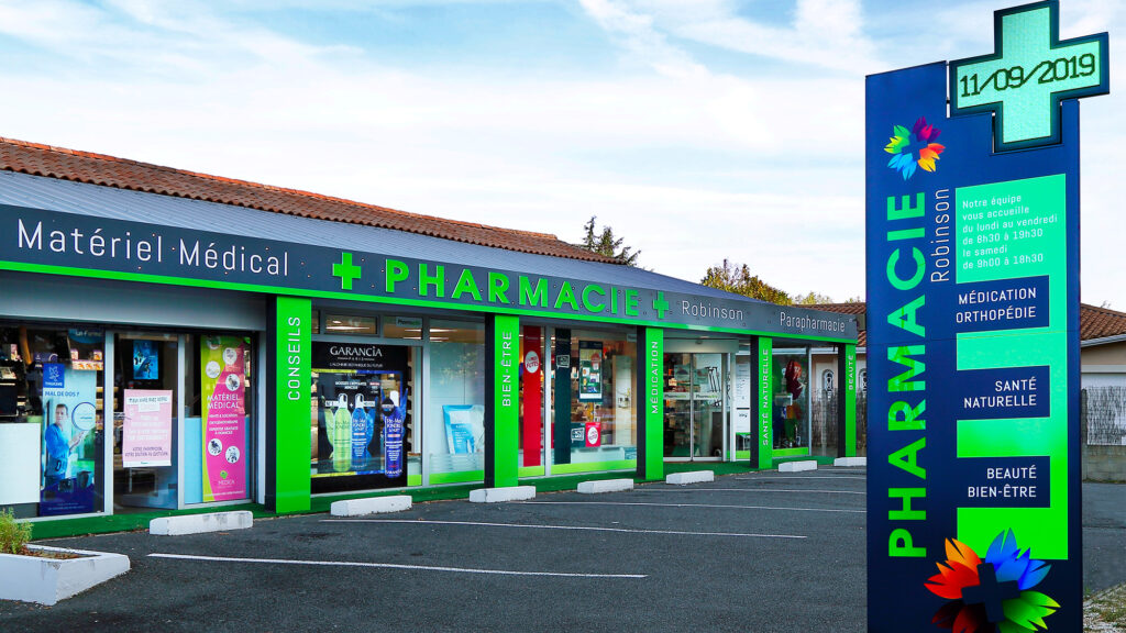 Enseigne de pharmacie Robinson : visibilité et conformité en façade